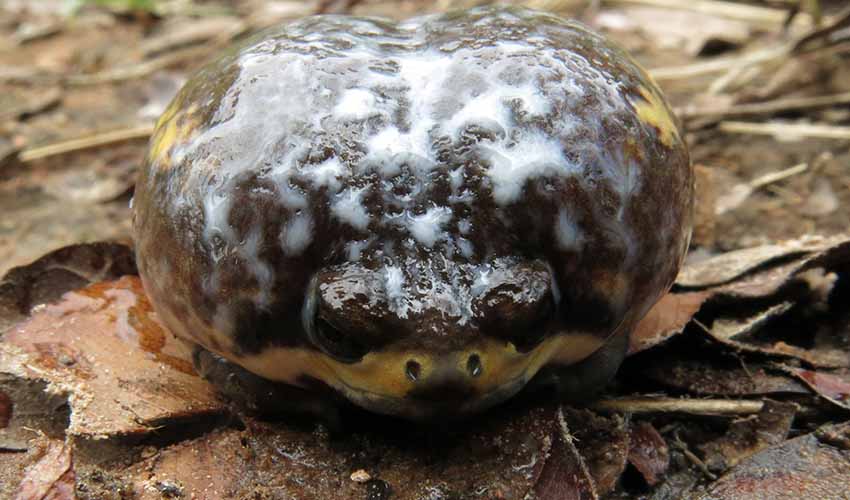 The predominantly terrestrial hairy frog lives in subtropical and tropical forests & rivers of West Africa