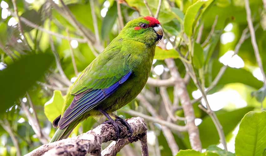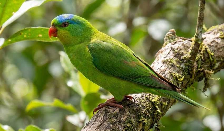 The bright red patch on its forehead gives the bird a “smiling” or expressive look