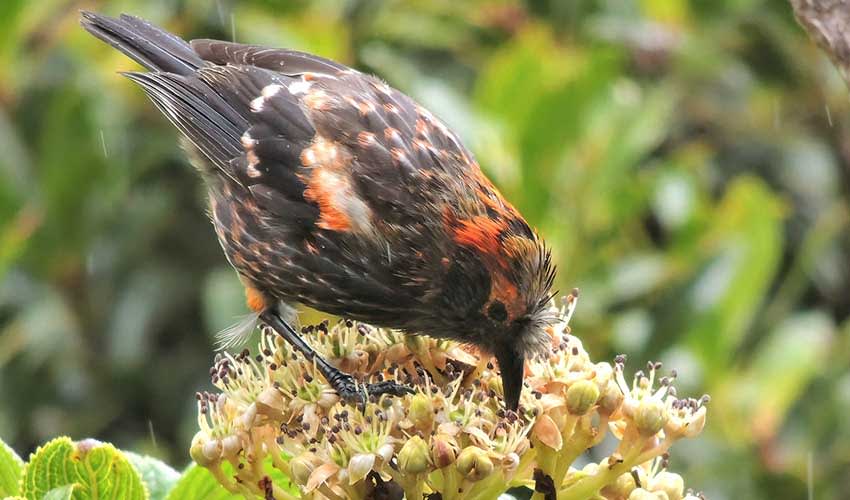 The ʻakohekohe is a nectar specialist, meaning it mainly feeds on the sweet nectar of native Hawaiian plants like ʻōhiʻa lehua blossoms. Its curved bill and brush-tipped tongue are perfectly designed for this job. As it feeds, it also acts as a pollinator, transferring pollen from one flower to another and playing a vital role in keeping native plant species healthy and reproducing. In other words, this flashy bird is not just a show-off—it’s a key part of the ecosystem.