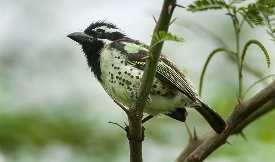This beautiful bird is adorned with a notable black neck patch and a strongly striped face, which adds to its unique appearance and makes it easily identifiable in its habitat. Found primarily in thorn scrub and dry savanna environments, the black-throated barbet occupies a range of habitats across its distribution range.