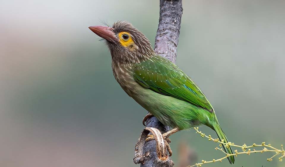 The brown-headed barbet has a stocky build, a large, pale beak, and a short tail. Its head is a soft brown or olive-gray, contrasting with a mostly bright green body and hints of yellow around the throat or chest. It has white streaks on the face and neck and pale blue patches around the eyes, giving it a slightly quirky expression. The bare skin around its eyes is often tinged blue or gray, depending on age and lighting.