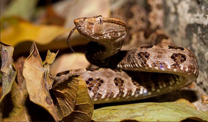 Its name comes from its pattern of dark brown, oval-shaped spots along a lighter brown or gray body, which help it blend into forest floors, rocky terrain, and agricultural fields. With its triangular head, slit pupils, and earthy camouflage, it has the classic “viper look.”