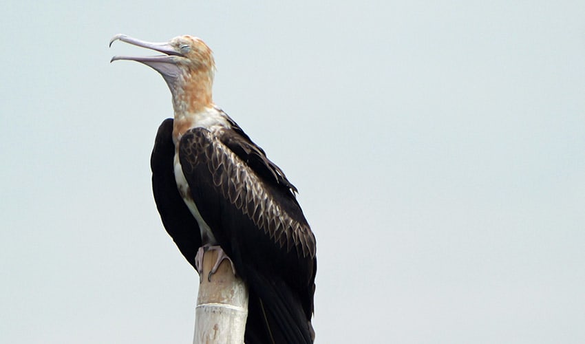 In appearance, the Christmas Island frigatebird is sleek and dramatic. Adult males are entirely black except for a bright red throat pouch, which they inflate like a balloon during the breeding season to attract females. This striking display is one of the most eye-catching courtship behaviors among seabirds. Females are slightly larger and have a white eye ring and pale chest markings, giving them a more patterned look. Young birds look very different from adults, with white heads and lighter bodies, and they take several years to fully mature.