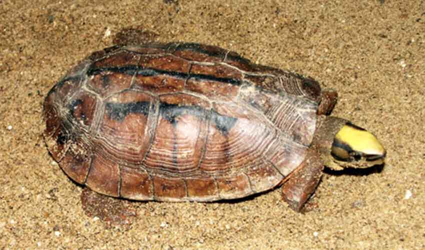 One of the most unusual and highly prized turtles in the world, known for its shining yellow-orange plastron (the underside of the shell), which gave it its name. Found mainly in southern China and northern Vietnam, this species has a dark, slightly domed carapace (top shell) marked by three faint ridges running lengthwise, and a bright golden underside that glows when turned over—like a coin catching the sun. Its head is also distinctive, with yellow to orange markings against olive or brown skin. Like other members of the box turtle family, it has a hinged plastron that allows it to close its shell tightly, hiding all its soft parts inside like a living box. What makes the Golden coin turtle different from its close relatives is its radiant plastron, its long history of cultural importance in Asia, and, sadly, its extreme rarity in the wild.