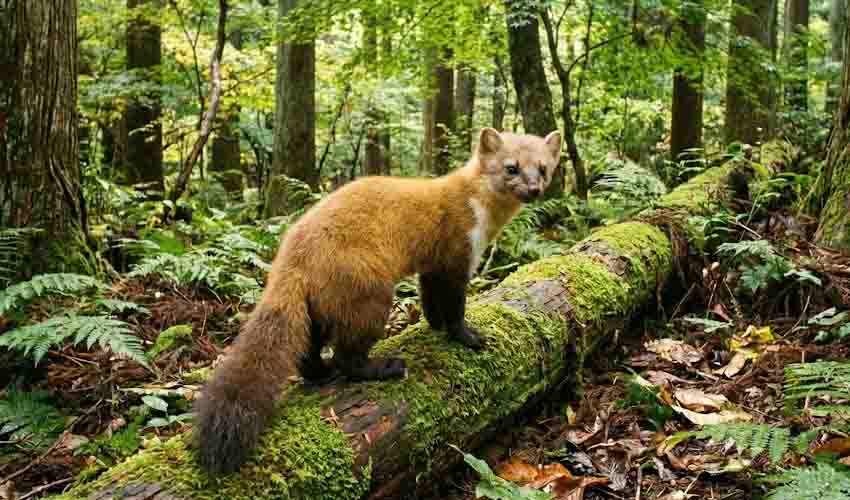 A slim, bright-eyed member of the weasel family that looks like it was built for speed, balance, and curiosity. It has a long, flexible body, short legs, and a thick tail that works like a balancing pole when it climbs and jumps. Its coat can range from golden-yellow to warm brown, often with a paler face and underside that make it look softly “sunlit” even in shady woods. The ears are small and rounded, the muzzle is pointed, and the whole animal gives off an alert, ready-to-dart energy—like it’s always halfway into its next adventure. In winter, the fur can look fuller and richer, helping it handle colder mountain forests, while in warmer seasons it tends to appear sleeker.