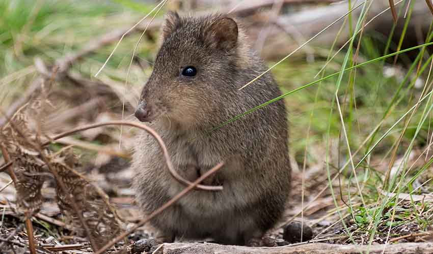 A small, shy marsupial that looks like a mix between a tiny kangaroo and a big, long-nosed rat. It lives in south-eastern Australia and Tasmania, mostly in dense heathy or shrubby ground where it can hide easily. Its body is about rabbit-sized, with a rounded back, short neck, and a long, pointed snout that’s perfect for sniffing through leaf litter. The fur is usually grey-brown to brown on top and paler underneath, often with a slightly grizzled look, and the tail is fairly long, thin, and sparsely furred. When it moves, it doesn’t scurry like a mouse—it hops on its strong back legs in short bounds, using its smaller front paws for digging and handling food, just like a mini kangaroo built for life in the undergrowth.
