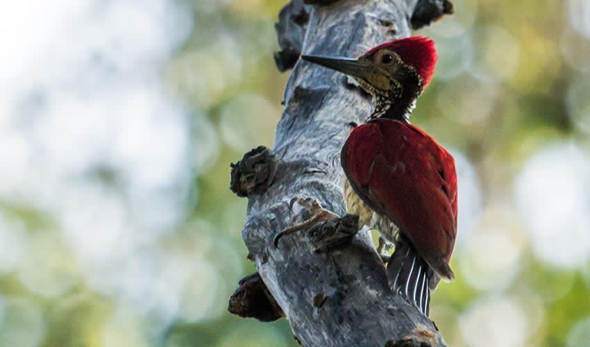Like other flamebacks, the Luzon flameback is a master of woodpecker engineering. Its sharp, chisel-like bill is designed for hammering into tree trunks, both to uncover insects and to drum out its presence. The sound of its drumming—loud, rolling, and resonant—serves as both a territorial claim and a call to mates, echoing through the Philippine forests. To keep its balance, the bird uses its stiff tail feathers like a tripod, propping itself up as it works. Its zygodactyl feet (two toes pointing forward, two backward) allow it to cling firmly to vertical surfaces, turning tree trunks into highways and hunting grounds.