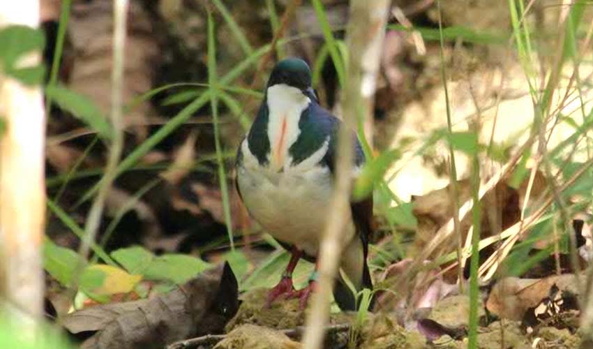 Physically, the Negros bleeding-heart is a medium-sized ground-dwelling pigeon. Its plumage is an exquisite blend of colors: iridescent green and blue feathers cover its head, back, and wings, while its underparts are pure white, dramatically marked by the deep red or blood-colored patch that appears to “bleed” from its chest. The neck has a delicate violet sheen, and its wings and tail are edged in soft gray. Its eyes are dark and gentle, and its legs and bill are pinkish. While it spends most of its life on the forest floor, walking gracefully through the leaf litter in search of fallen fruits and seeds, it can fly swiftly if startled—darting into the understory with a flash of color and a sound like the rustle of silk.