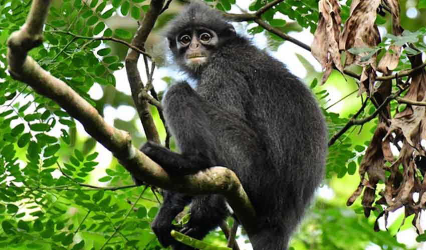 It spends nearly all of its life high in the forest canopy, feeding mainly on young leaves, fruits, seeds, and flowers. Like other leaf monkeys, it has a specialized multi-chambered stomach filled with microbes that help digest fibrous plant matter—an adaptation that lets it thrive on a diet few other animals can stomach. Because of this slow, fermentation-based digestion, these langurs spend much of their day quietly resting or grooming rather than moving constantly.