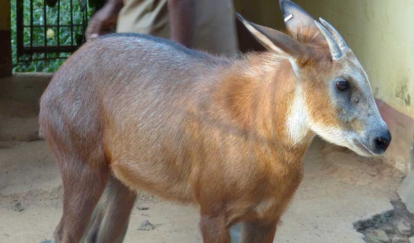 A sturdy, mountain-and-forest animal that looks like a mix of a small goat, a compact antelope, and a shaggy little boulder come to life. It has a thick, bristly coat that can range from rusty red to dark chestnut, often with darker shading along the back and lighter tones on the throat or face. Its body is stocky, with strong shoulders, short powerful legs, and wide, gripping hooves made for steep, slippery ground. Both males and females usually have short, slightly backward-curving horns, and the horns look more like tough little spikes than the long sweeping horns people picture on many antelopes.