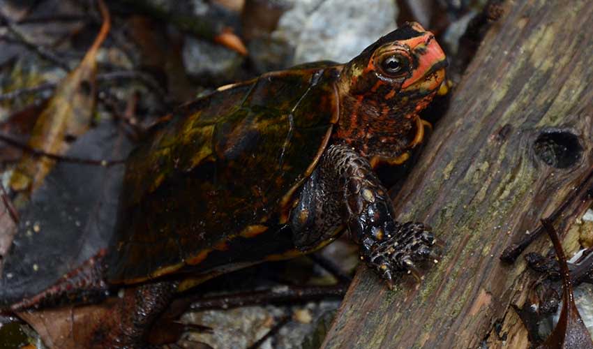 Unlike fully aquatic turtles, the Ryukyu black-breasted leaf turtle prefers damp woodlands and often hides in leaf litter, under rocks, or among roots. It does, however, make use of shallow pools and puddles, especially during wetter months. Its diet is omnivorous, consisting of worms, insects, fallen fruit, and plants, which makes it highly adaptable to its forest environment. Mostly nocturnal, it emerges at night or in the early hours of dusk and dawn to forage, relying on stealth and camouflage to avoid predators. Despite its small size, it has a feisty streak—when disturbed, it may snap or hiss, showing that it is not as timid as it looks.