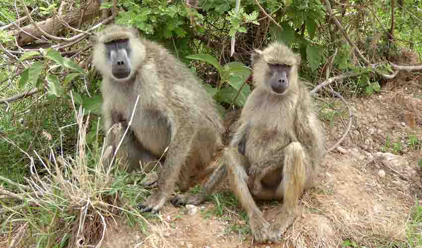 Males are larger than females and have heavier shoulders and longer canine teeth, but they don’t have big shaggy manes like hamadryas or Guinea baboons, so a troop of yellow baboons looks fairly sleek overall. Their tails have that classic baboon shape: they go up at the base and then curve down, so when a group walks away, you see a line of bent tails and golden backs.