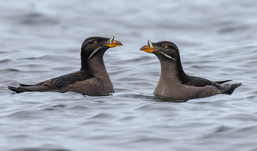 Like its puffin relatives, the Rhinoceros Auklet is a superb underwater hunter. It uses its wings as flippers to “fly” beneath the waves, chasing after small schooling fish like anchovies, sand lance, and herring. Unlike puffins, which usually carry a few fish crosswise in their bills, Rhinoceros Auklets are capable of cramming their bills full of dozens of fish at once, neatly lined up and sticking out at both ends of the beak like a feathered fisherman’s catch. This adaptation is particularly important during the breeding season, when adults make repeated fishing trips to feed their chicks.