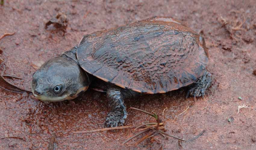 Chelidae turtles’ skin color ranges from olive to brown, often accompanied by black markings on the top of their heads, which may serve as camouflage or for species identification. The shell, or carapace, is typically dark brown, robust, and streamlined for efficient swimming. Their plastron, the bottom part of the shell, is usually lighter and can sometimes show complex patterns.