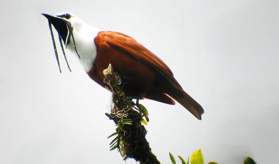 Often called umbrellabirds because of the strange, umbrella-like decorations on their heads