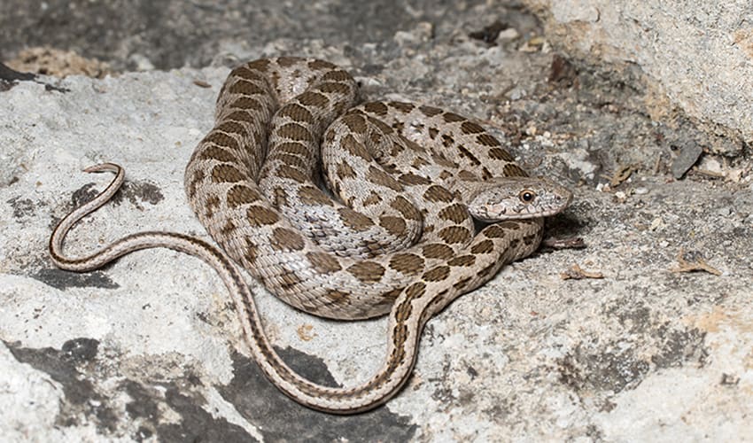A defining feature of Hemorrhois snakes is their bold patterns and coloration. Depending on the species, they can display rows of dark spots, zigzag stripes, or crossbands on sandy brown, gray, or olive backgrounds. This camouflage blends them into dry, stony landscapes and gives them a handsome appearance. Unlike venomous vipers with broad heads and slit pupils, Hemorrhois snakes have narrow heads and round pupils, signaling their harmless nature to humans. Yet despite being non-venomous, they can be quite defensive if threatened, hissing loudly, inflating their bodies, and striking repeatedly to scare away predators.