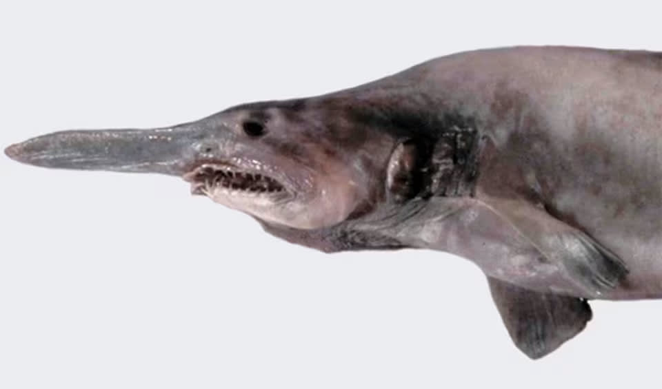 The most distinctive feature of the goblin shark is its long, flattened snout, which protrudes far beyond its mouth. This snout is covered in sensory organs that help the shark detect the electrical fields produced by its prey, which is crucial for hunting in the deep, dark waters where it lives. The snout, combined with the shark’s pale pinkish-gray color, gives it a ghostly, almost eerie appearance, which is why it has been nicknamed the “goblin” shark.