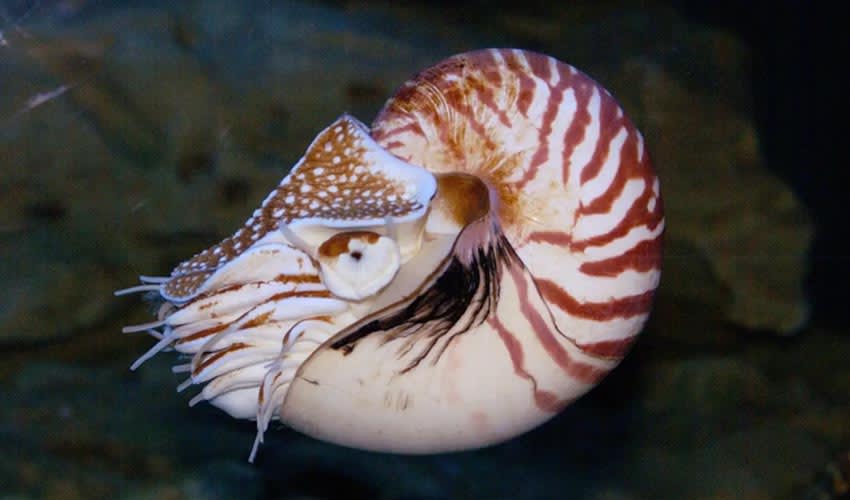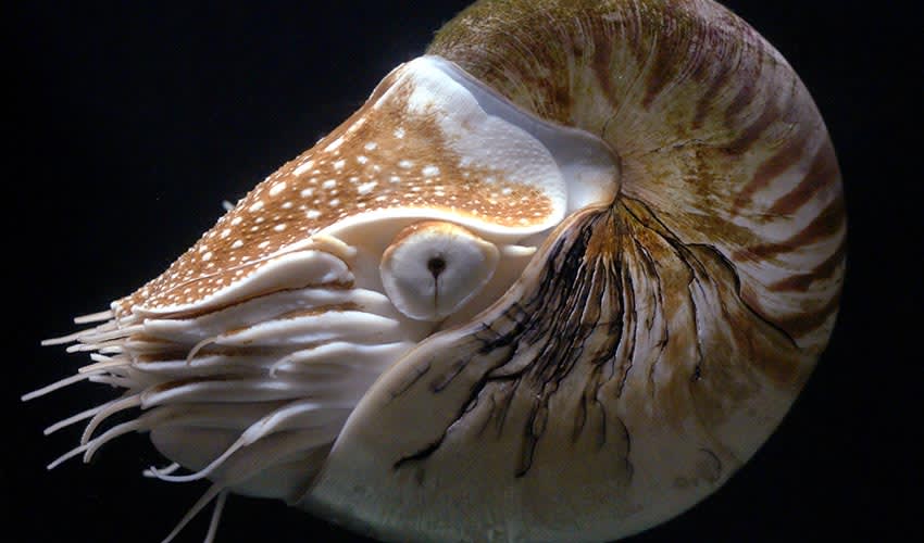 What makes Nautilida unique among cephalopods is their external shell, which is divided into chambers. The nautilus lives only in the outermost chamber, while the inner chambers are filled with gas that help control buoyancy. This allows the nautilus to rise or sink in the water without using much energy—like a natural submarine. Unlike their fast-swimming cousins like squids and octopuses, nautiluses are slow-moving and rely on jet propulsion by squirting water through a siphon to navigate the ocean depths, usually staying between 100 and 500 meters deep, though they can go much deeper.