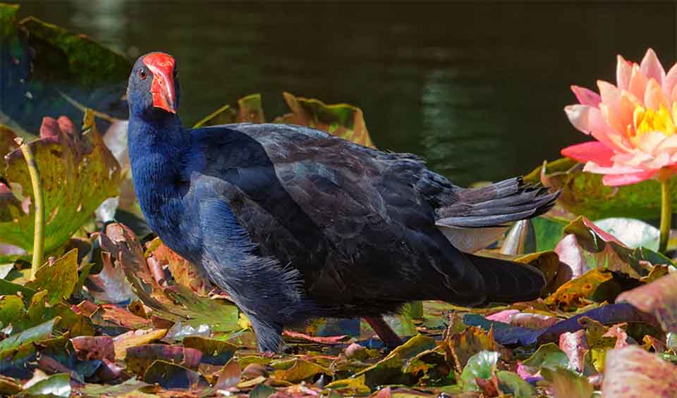 Swamphens are excellent swimmers, wading through shallow water with ease, but they are also strong walkers. Their large feet and long legs enable them to move across mud, reeds, and floating vegetation effortlessly. Unlike many waterbirds, they are not fully aquatic and spend much of their time on land or among dense reeds. Though they are capable of flight, swamphens usually prefer short bursts rather than long migrations, and they rely on their legs for most of their movements.