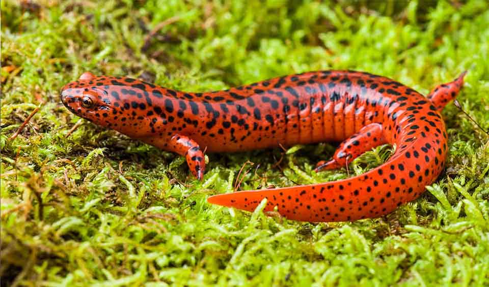 Red salamanders are easy to identify: bright red with black spots and bright yellow eyes