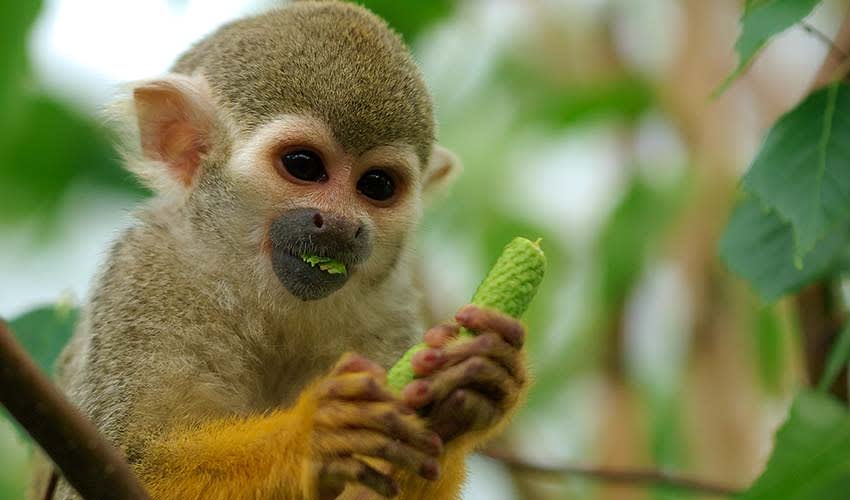 Squirrel monkeys are also known for their high intelligence. They have some of the largest brains relative to body size among primates, second only to humans, which makes them excellent problem-solvers and quick learners. In the wild, they use complex vocal calls and even urine-marking behaviors to communicate with troop members and navigate their dynamic social hierarchies. Because of their intelligence and adaptability, they were once widely used in biomedical research, though today this has raised ethical concerns.